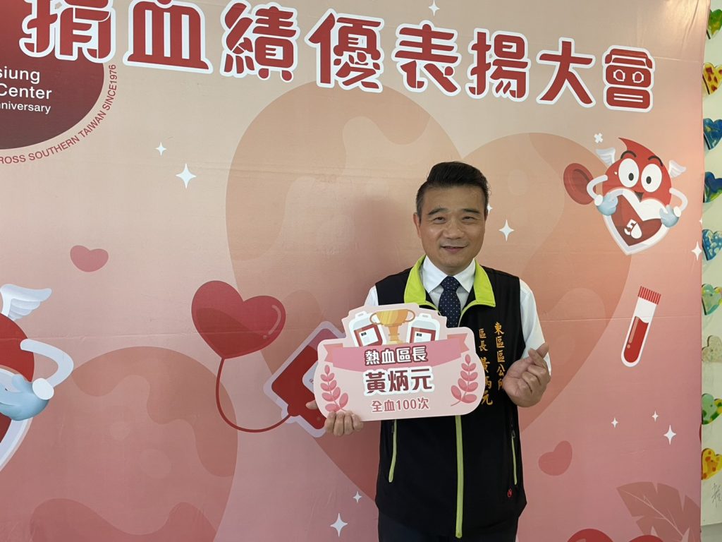 東區區長黃炳元長年投入捐血,累計全血捐血達100次,展現以身作則的公益精神。(記者林怡孜攝)