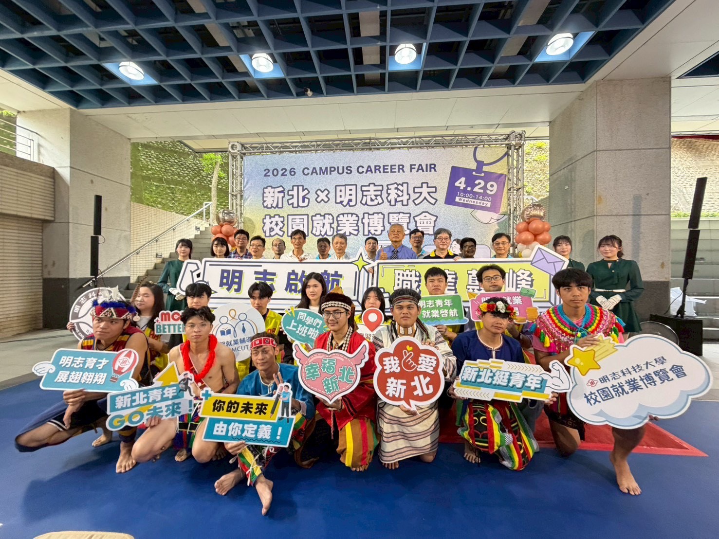 今天活動以「明志啟航,職達顛峰」為主軸,由明志原住民青年社熱情開場,並由校長劉祖華及新北市勞工局長陳瑞嘉共同剪綵為活動揭開序幕。