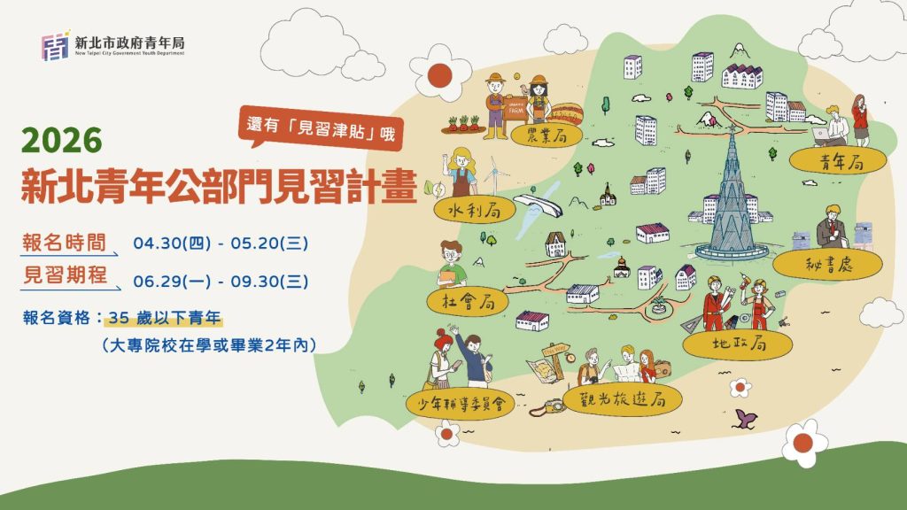 新北市青年局今(115)年首度攜手觀光旅遊局、社會局、地政局等8個局處推出「115年度青年公部門見習計畫」,釋出24個見習職缺,涵蓋社群企劃、政策創新規劃、活動執行及社會服務等多元領域,並提供見習津貼,自即(30)日起開放報名至5月20日止,邀請18至35歲青年把握機會,走進市府第一線,體驗不一樣的職場生活!