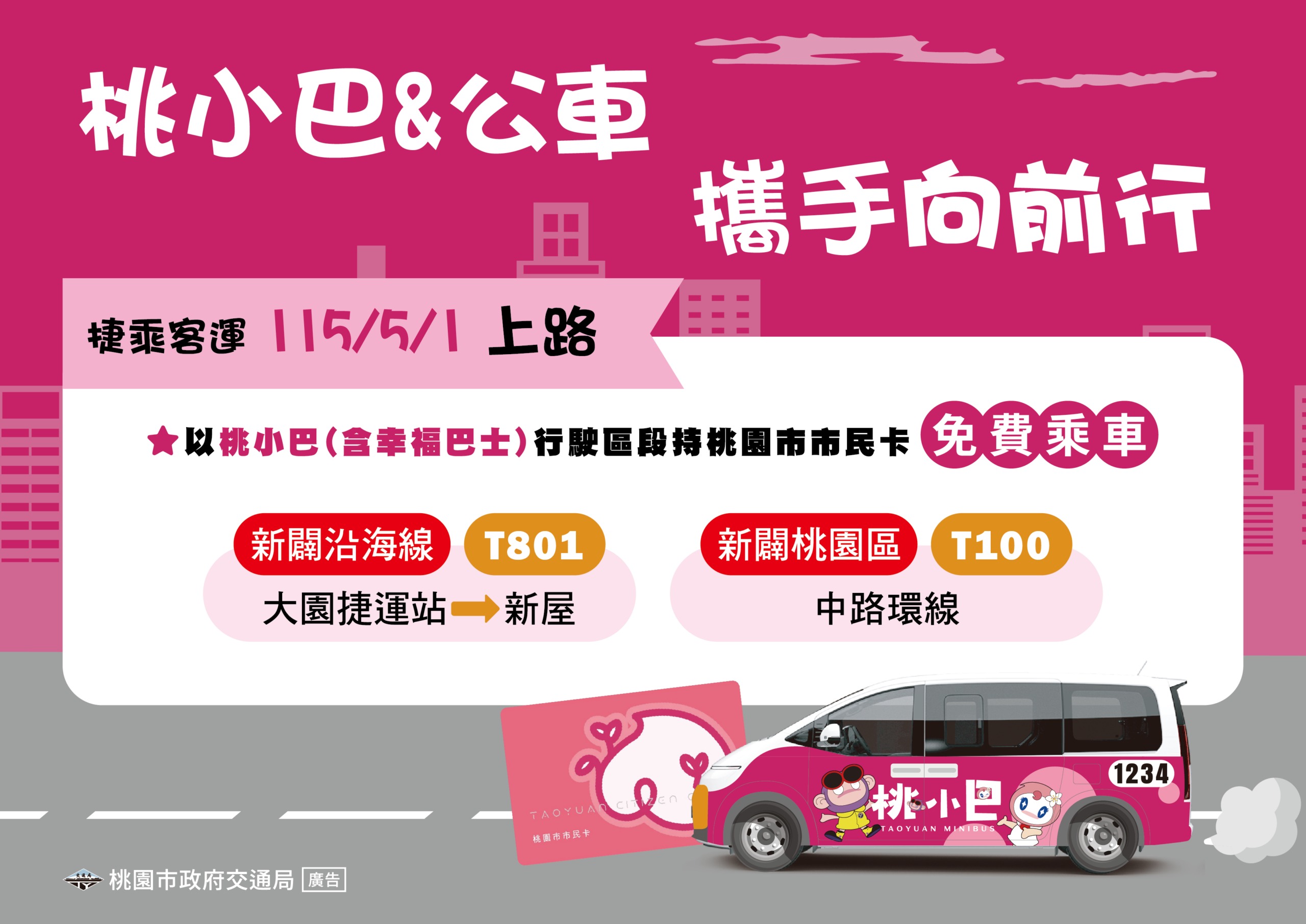為提升市區公車服務品質及便利使用,桃園市交通局持續推動「桃小巴」計畫,先前將公車路線轉型為九人座之「桃小巴」,提供更靈活、貼心的九人座小客車服務,並享有持市民卡乘車免費優惠。此次新闢試辦沿海線「T801」大園捷運站-新屋及桃園區「T100」中路環線兩條「桃小巴」路線,自5月1日起正式提供服務,將先行試辦三個月至7月31日。