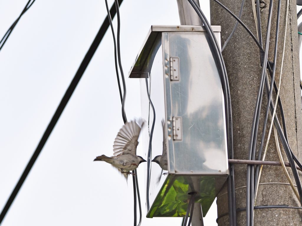 鳥友說,碧雲寺一帶的路燈開關箱有像鏡面的不鏽鋼顏色,也有綠色,特別的是,山麻雀只會衝撞不鏽鋼顏色的開關箱,研判可能鏡面不鏽鋼開關箱看到自己,卻以為是其他鳥類入侵自己的領域,所以才有衝撞驅趕的動作出現。