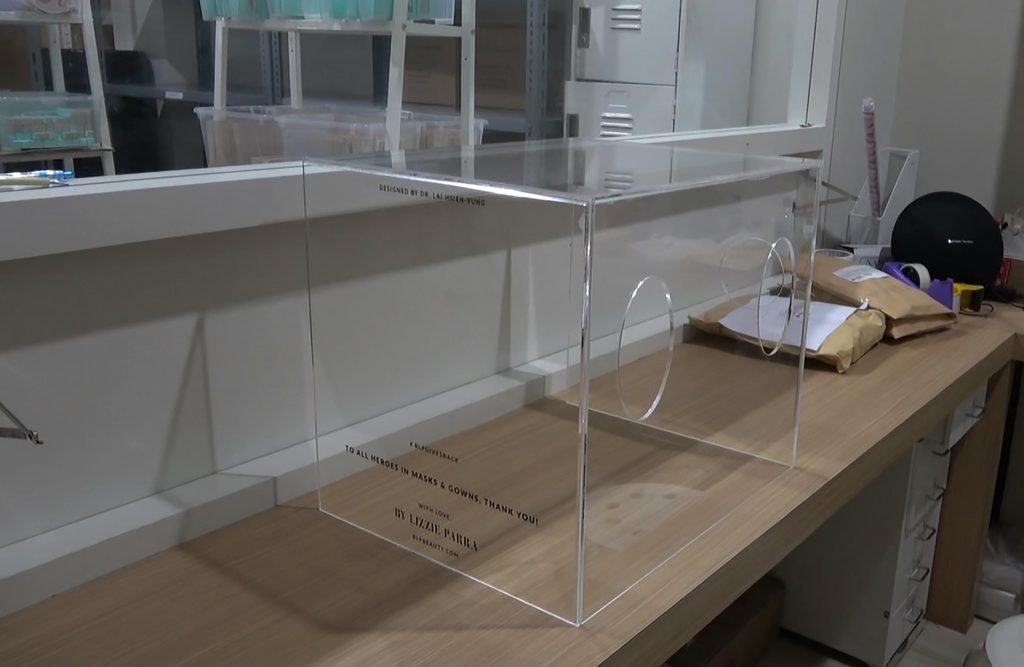武漢肺炎患者如需接受插管治療時,醫生在治療過程易被患者飛沫傳染。若患者頭部罩上「防疫箱」,醫生可將手從「防疫箱」的兩個洞口伸進去治療,隔著可擋住患者飛沫的「防疫箱」,可降低感染風險。