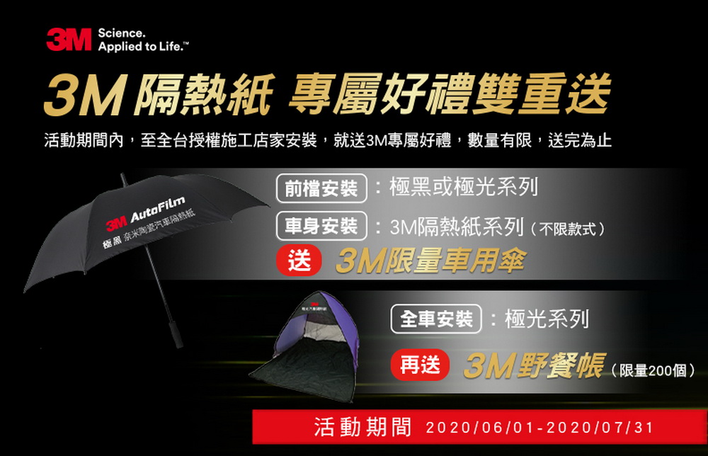 M夏季隔熱大作戰活動開跑,凡自即日起至2020年7月31日止,至全台灣3M特約施工通路指定前檔安裝3M「極黑」或「極光」系列隔熱紙,搭配車身安裝3M不限款式隔熱紙,即可獲得3M限量車用傘一只,全車安裝「極光」系列再贈3M野餐帳一頂,名額有限,送完為止!