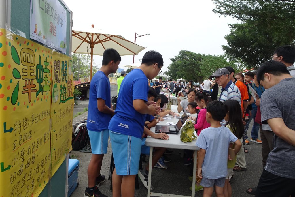 「聽聽澤蛙、貢德氏赤蛙和莫氏樹蛙…能分辨出蛙的叫聲就過關…」,昨天根與芽動物嘉年華充滿知性,連蛙的叫聲傳達何意都成了闖關的題目,如此的設計來自仁德文賢國中,學生們在河堤道上播放著青蛙的叫聲,讓大家分辨,也教大家做青蛙摺紙,還準備山粉圓讓大家解渴,相當貼心。