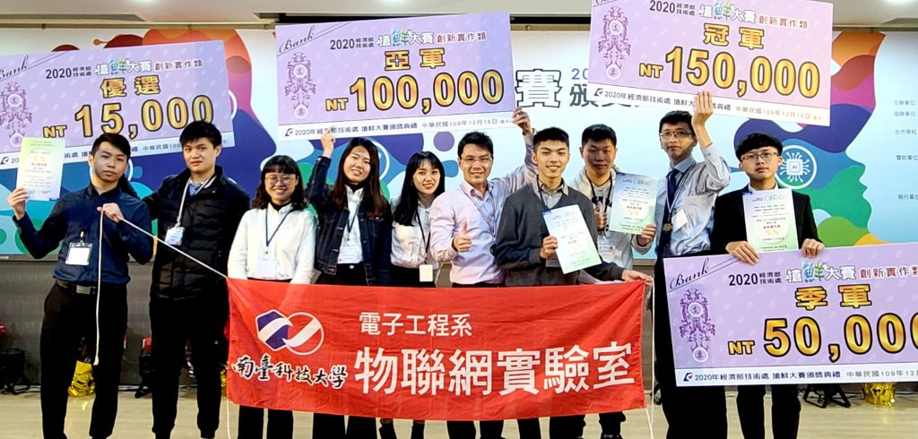 南台科大電子系副教授張萬榮及創新產品設計系副教授歐陽昆跨系合作,共同指導學生團隊參加經濟部技術處二0二0搶鮮大賽,在三百餘件作品中脫穎而出進入總決賽,拿下創新實作類大滿貫佳績,包括冠、亞、季軍及優選共計獲得三十一萬五千元獎金。