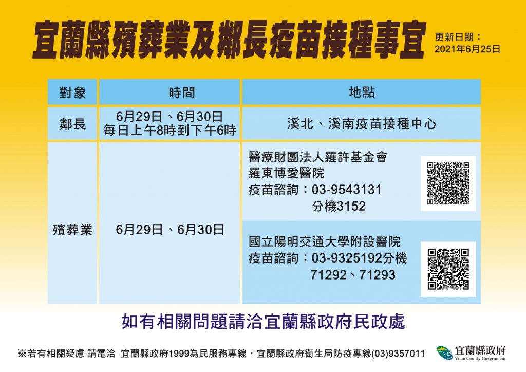 林姿妙縣長表示,由於鄰長及殯葬業(搬運大體人員)屬實際執行防疫工作人員,日前縣府向中央爭取將其列為第二類公費施打人員,特別感謝中央同意列入。目前將安排在六月廿九、三十日,分別為殯葬業人員及鄰長施打疫苗,後續施打時間將由民政系統安排及通知。