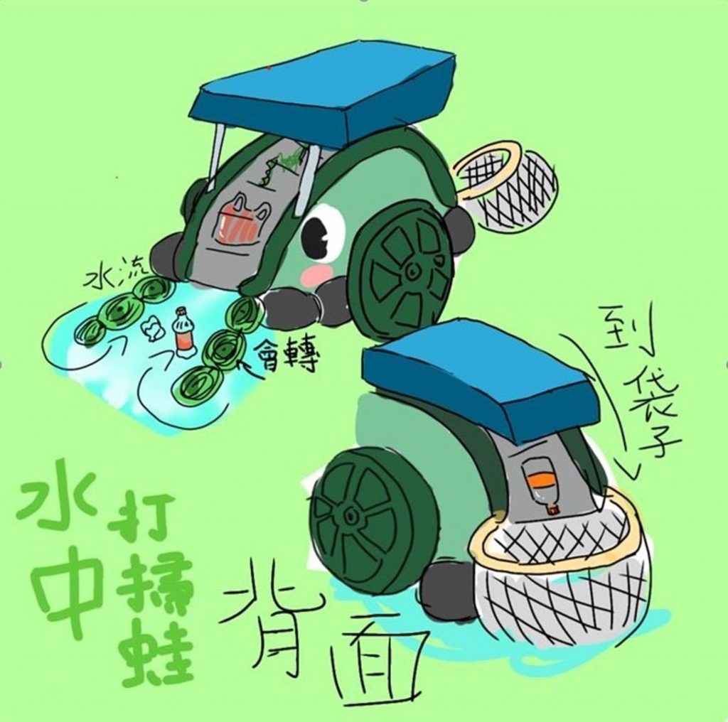 設計水中打掃蛙的張苡安說,打掃蛙可透過太陽能提供電力,將AI鏡頭放在打掃蛙的眼睛,當發現蒐集水面垃圾集中後,便開啟清理垃圾模式。 李研築則設計垃圾章魚輪,透過遙控的方式在水面移動,使用抽水的幫浦把水打進機器裡,製造水位差來集中垃圾,當垃圾滿了,還可以發訊息通知來收垃圾。