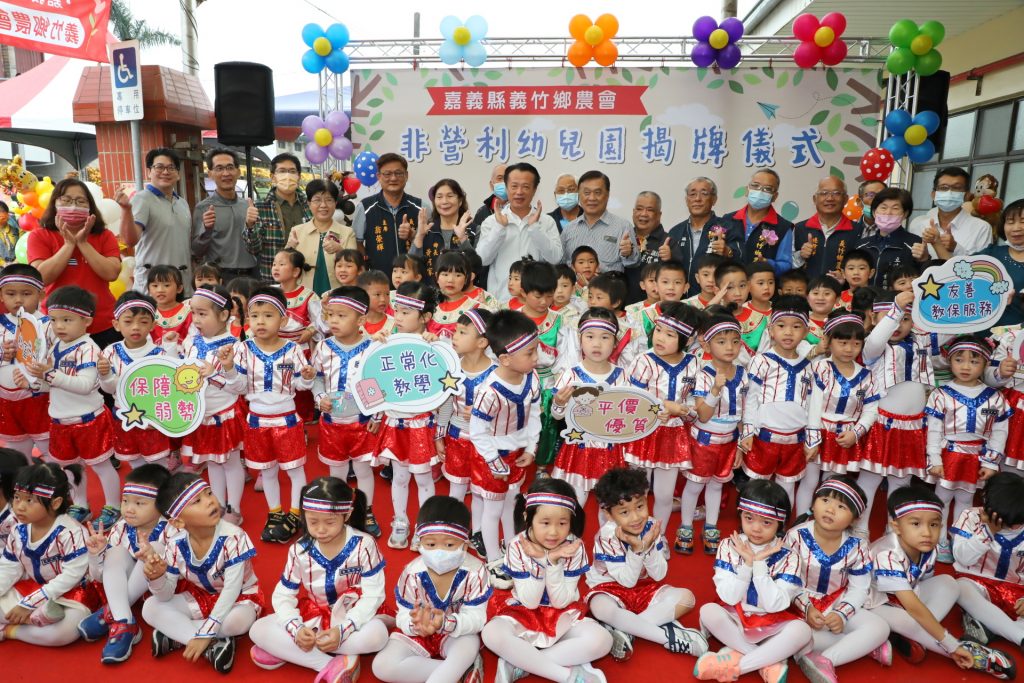 為提供更平價、更優質的教保服務,農會一一0年與政府簽約轉型為「非營利幼兒園」,共開設五班,招收二-三歲幼兒三十二名二班,以及三歲到學齡前幼兒九十名三班。十三日上午由縣長翁章梁、立委翁重鈞、義竹鄉長黃阿家、農會理事長顏明岳、總幹事翁永寧和各級民意代表、地方人士主持揭牌儀式,小朋友以太鼓熱鬧開場,翁章梁和貴賓還與小朋友玩氣球傘,以辦喜事心情迎接這場地方ㄟ大代誌。