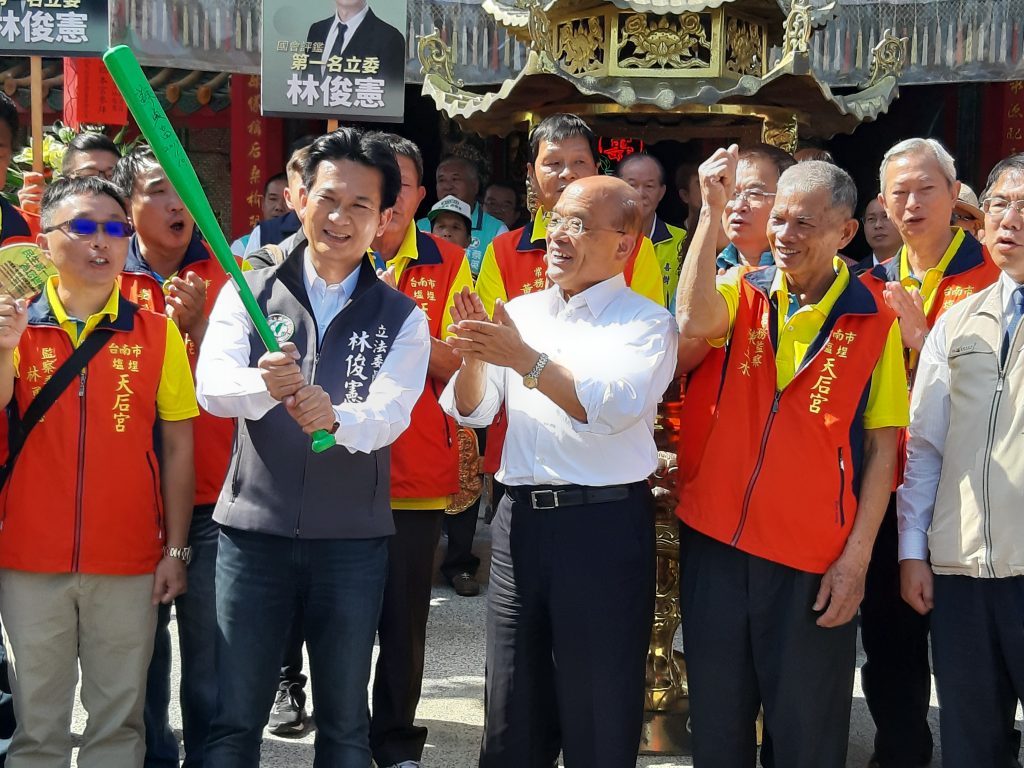 行政院長蘇貞昌十日南下南區鹽埕天后宮及北極殿參拜,並致贈陪同參拜的立委林俊憲簽名球棒,希望不僅南市立委全上壘,也希望民眾支持蔡英文及民進黨。