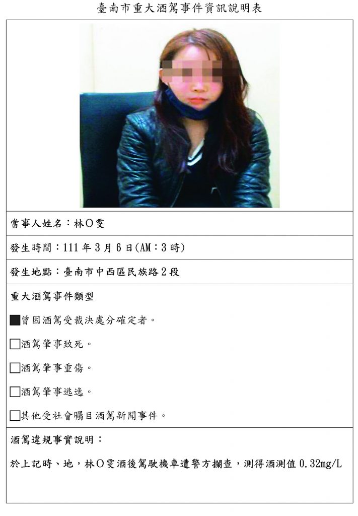 首波被公布的分別是警方在麻豆區謝庴寮、下營區九份街、中西區民族路二段攔獲謝姓、邱姓及林姓女子查獲涉嫌酒後開車、騎機車的再犯案件,酒測值分別為零點九、一點零三、零點三二,均依公共危險罪嫌移送偵辦。由於三人均曾因酒駕受過裁決處分確定的累犯,依《台南市重大酒駕事件資訊公開作業原則》公告在台南市重大酒駕件網頁。