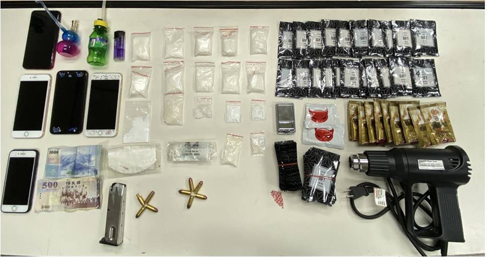 警方調查,李、石兩嫌平日透過LINE、微信等通訊軟體與買家聯繫,並以「男的、女的」作為毒品代號躲避警方追緝;警方蒐證完備後,於北屯區租屋處攻堅搜索,當場起獲第一級毒品海洛因五包(總毛重:二十九點六四公克)、第二級毒品安非他命十三包(總毛重:一八六點五三公克)、第三級毒品咖啡包二十五包(總毛重:一一0點0七公克)、手槍子彈九顆、手槍彈匣一個、毒品吸食器兩組、熱風槍一支、咖啡包空分裝袋一六六個、手機六支等不法證物。