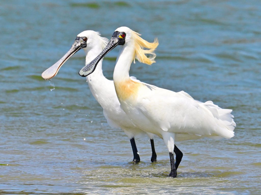 來台度冬的黑面琵鷺長出金黃色繁殖羽。(郭東輝提供)