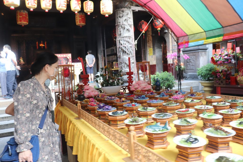 而在天公爐旁布置的五十四種栩栩如生的動物造型的米粿雕,在手工春仔花纏繞下,顯現精湛工藝外,也看得出廟方的虔誠心、用心與細心感念聖母恩澤。