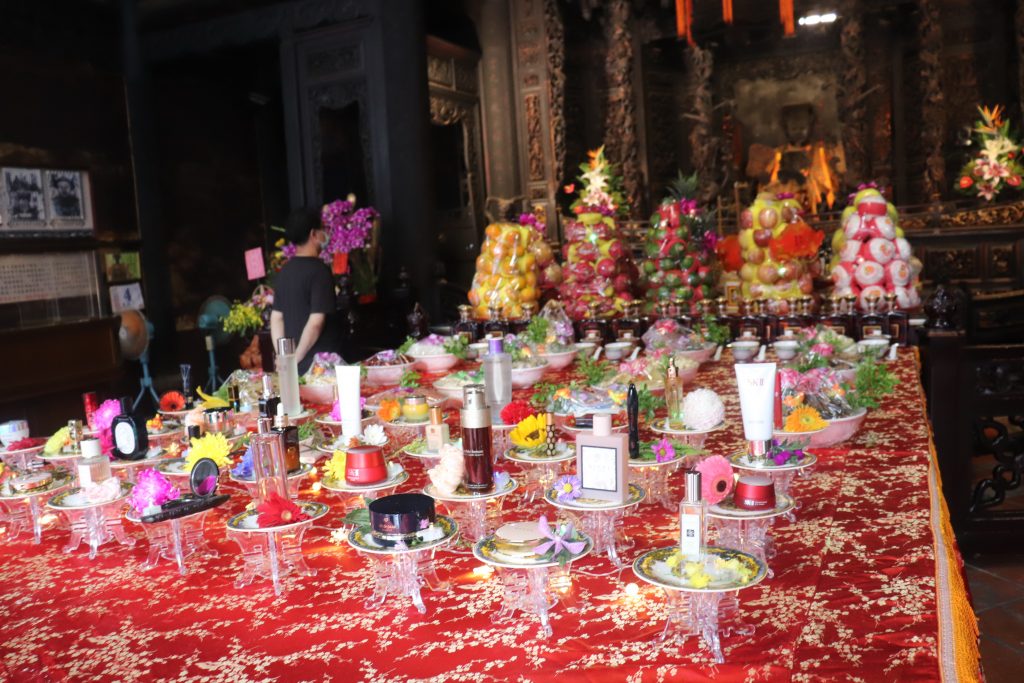 昨天媽祖飛昇得道紀念日,鹿港天后宮一整天除廟口公演三天的歌仔戲之外,廟裡廟外大批信眾戴口罩進廟上香祝禱,管委會也在正殿布置各式各樣的名牌化妝品等宴媽祖。