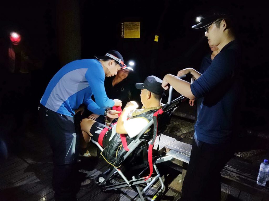六十六歲許姓男子九日在台中和平走波津加山步道,右腳扭傷無法再走,台中市消防局派隊員上山救援,以人工背負及搬運椅方式下撤,今晚走回登山口處。