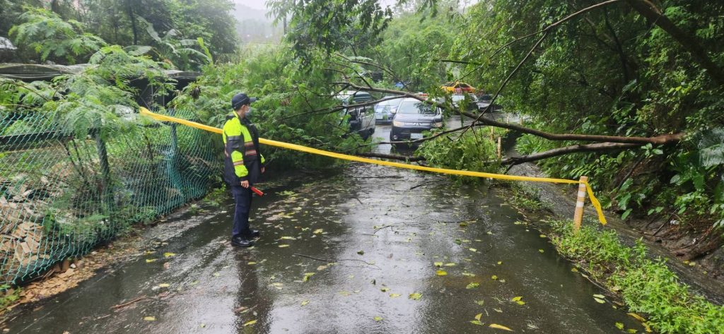 警三分局百福派出所十一日中午左右,接獲通報指稱,轄區基市七堵區長安街233巷,發現有路樹倒塌阻礙交通,影響行車安全,需要警方協助。派出所警員朱彥澄及復興派出所警員陳祐良等人獲報,趕到現場,看見路樹傾倒,佔據車道阻礙車流通行,員警現場立即實施交管並提醒用路人注意行駛,並即時通報相關單位,三小時內順利清理完畢,交通恢復順暢。