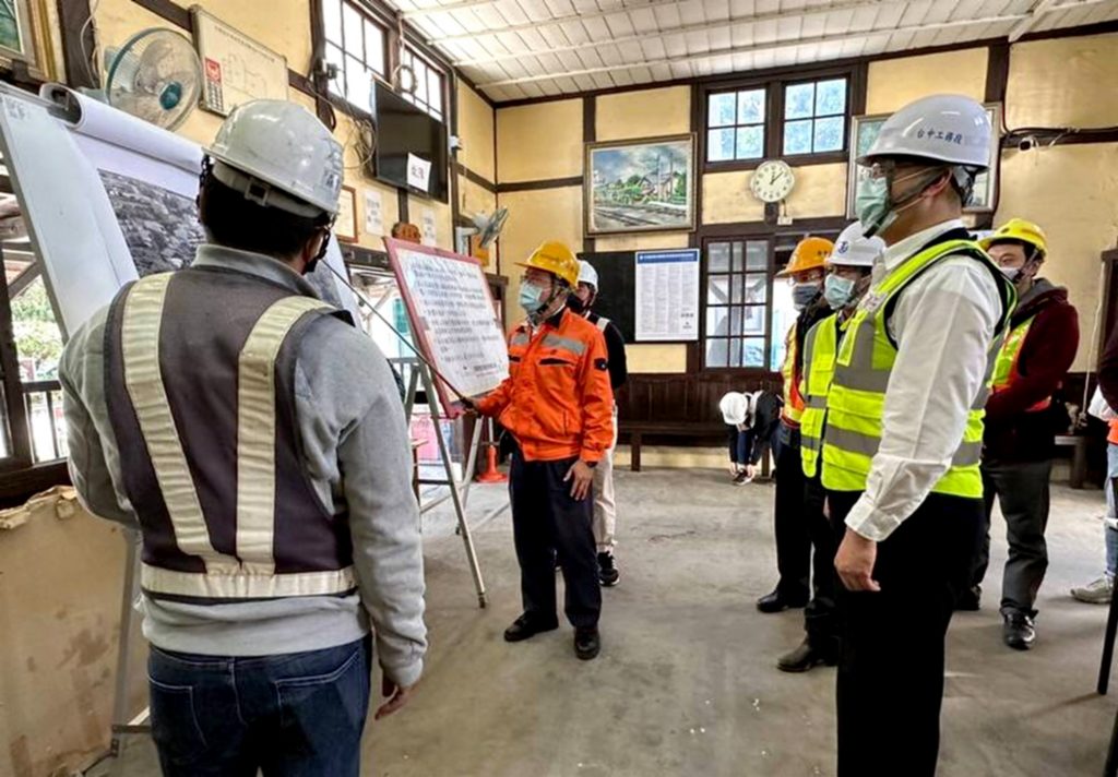 台鐵局長杜微視察追分站工程進度,並指示追分站設施改善首重安全及品質,希望能在一一二年元旦假期前啟用;啟用後相關停車位置的調整、進出站動線導引、月台地下道照明,都要特別注意,後續拆除臨時月台也要注意安全維護。