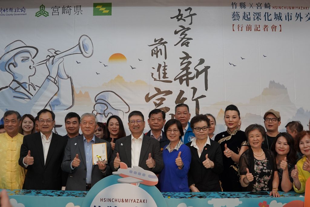 為宣揚竹縣在地客家文化、點亮疫後觀光,新竹縣長楊文科將於廿八日啟程前往日本宮崎,楊文科偕世界客屬總會長、前新竹縣長邱鏡淳,共同帶領新竹縣在地表演團隊及藝術家等約一百七十人,搭乘首航包機赴日本宮崎縣藝文暨觀光交流,宮崎副知事同時間也將率團訪問新竹縣,雙方藉國際交流提升疫後觀光、城市友好。