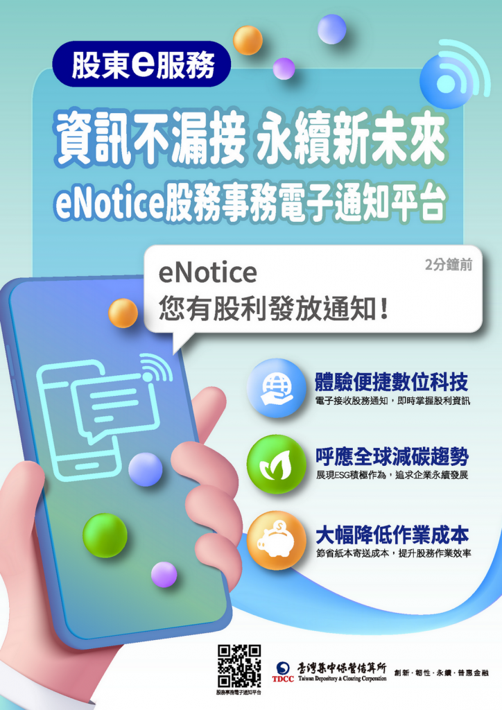 每年七至九月為除權息旺季,也是股民收到眾多股利通知書的月份,現行股利通知須逐一郵寄給股東,不僅耗時耗力,通知書紙張、印刷及郵寄所產生的碳排放也對環境產生負擔。隨著金融科技的發展、股務數位服務的推進,集保結算所積極推動發行公司採用股利發放電子通知服務,截至目前為止,已有超過五百五十家公司與集保結算所簽約使用eNotice平台,從今年配股配息時改採電子通知服務,顯現發行公司致力推動數位轉型及ESG永續發展,提供股東便捷、高效率的服務。
