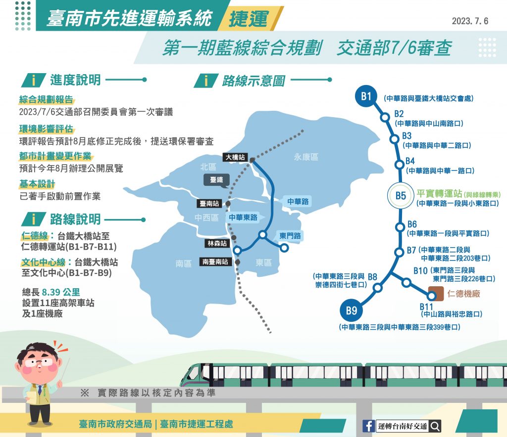 交通局局長王銘德表示,第一期藍線沿線行經奇美醫院、台鐵大橋站、台南高工、兵仔市場、平實轉運站、南紡購物中心、巴克禮公園、文化中心及仁德轉運站等重要節點,全線長度約八點三九公里,共設置十一座高架車站及一座維修機廠,採高架跨座式單軌系統進行規劃,計畫所需建設經費為三百九十二點五六億,市府爭取一一二年獲中央核定並以一一五年開工為目標,可望全線六年完工。