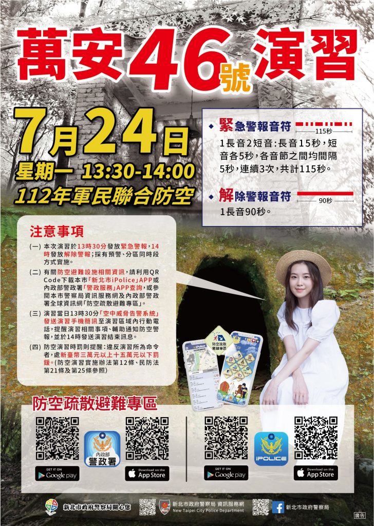 今(112)年度軍民聯合防空(萬安46號)演習北部地區即將於24日下午1時30分至2時,實施30分鐘警報傳遞與發放、疏散避難、交通管制及戰災搶救演練。因應兩岸對峙局勢升高,今年度萬安演習新北市由「淡水區」驗證「車停,人就近疏散」,要求行駛車輛聽聞防空警報時,除應靠邊停於安全處外,均應下車,駕駛、乘員聽從警察及義警、民防執勤人員引導,就近進入防空疏散避難設施,以驗證實際戰時景況。