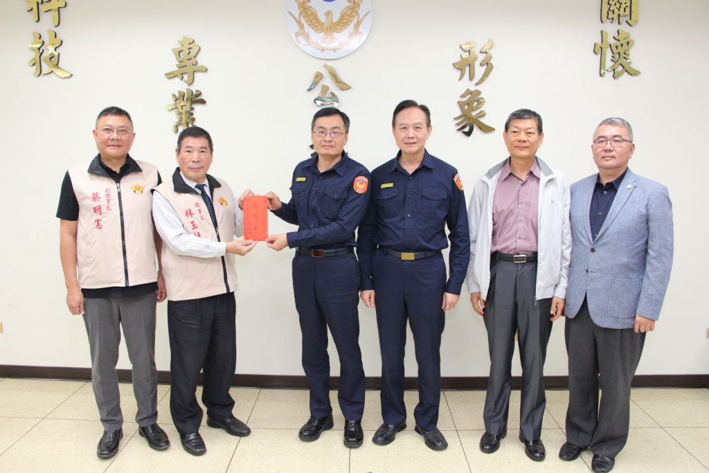 大台南警察之友會理事長林玉柱率副理事長蔡明憲、理事謝添寶、常務監事王秋明等人到市警局,頒發偵破白河炸彈客重大刑案獎金。