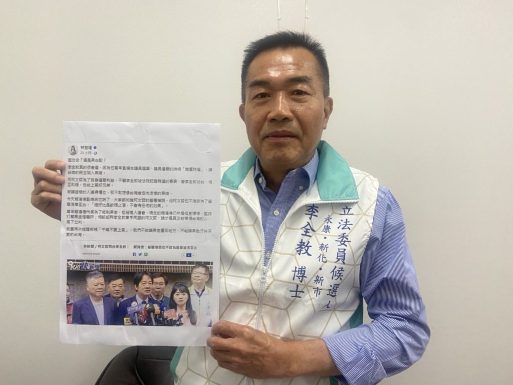 台南市立委第四選區參選人李全教重砲回擊賴清德、林宜瑾污衊他「雙重賄選」,是故意栽贓抹黑,意圖使他不當選,此舉嚴重違法,十六日他將向兩人正式提告,以訟止謗。