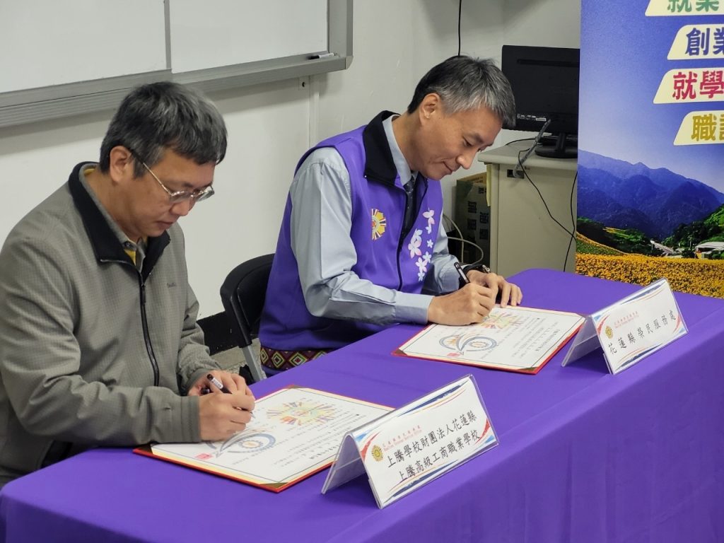 上騰工商校長吳昌吉表示,該校於一九七一年創立,原名中華工商,花蓮有太陽故鄉之稱,藉由迎向太陽,讓每個生命獲得能量,而「騰」達。該校設有飛機修護科、汽車科、觀光事業科、餐飲管理科、時尚造型科,目前已進用五名退除役官兵,其中總務處主任及學務處主任皆是由榮民擔任;此次與花蓮榮服處共同簽署合作備忘錄,讓雙方合作模式更緊密。