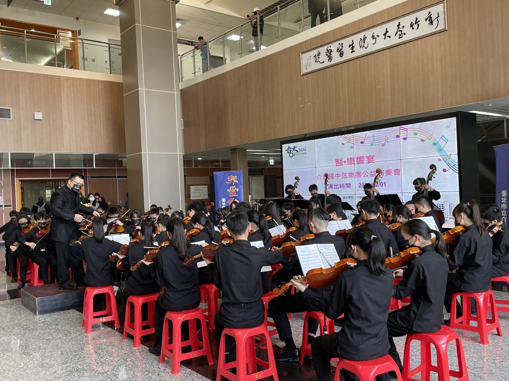 介壽國中弦樂團二0二二年受邀總統府元旦升旗典禮活動表演,孩子們以音樂回饋社會的善舉,更獲各界好評。這次該校跨縣市到新竹表演,藉由美妙的音樂向新竹臺大分院每一位病人、家屬及工作人員傳遞最棒的新春祝福。
