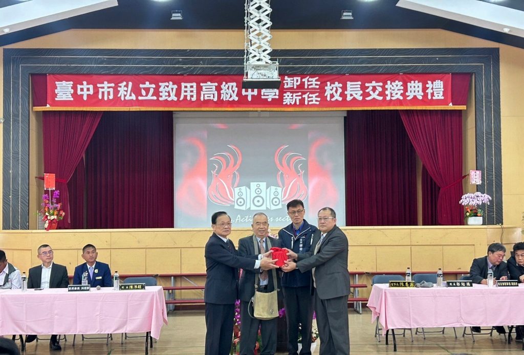 臺中市私立致用高中新學期自二月一日起,校長陳添旺屆齡退休,致用董事會遴聘富有教育熱忱辦學經驗豐富,曾任數所私立高中職校長,現任桃園市光啟高中校長鄒紹騰接任,五日上午舉辦交接典禮,來賓一致肯定任職三十四年的陳校長,推動教育,嘉惠學子事蹟可圈可點,想信屆後在鄒校長帶領下,可展現致用另一階段新的輝煌。
