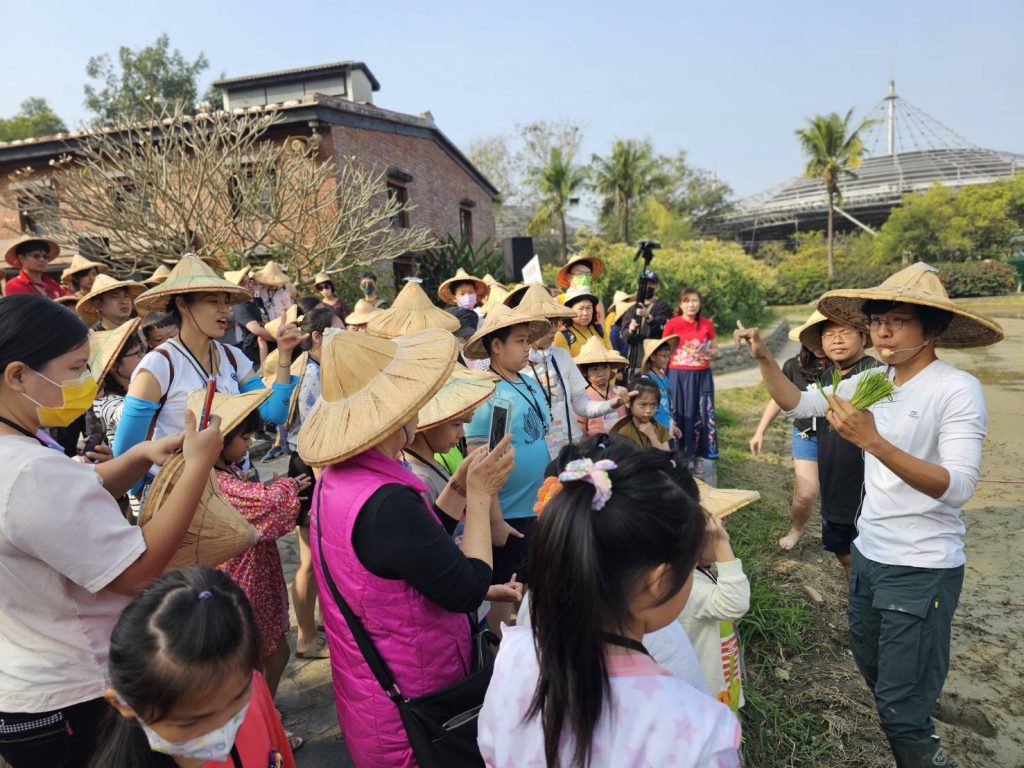 「春祈蒔田.共下來尞」插秧體驗活動藉由祭祀田頭伯公、蒔田,享用交工點心,一系列體驗早期客庄農耕的氛圍及特有的交工文化,讓民眾認識傳統農耕文化,達到人文共生、共存的永續發展理念。現場更是邀請到屏東觀光酒廠副場長張國棟分享如何運用園區栽種的稻米透過百年酒廠製作「六堆好酒」的故事,展現客家文化與環境教育結合的樣態,實踐生態博物館的知識教育推廣功能。