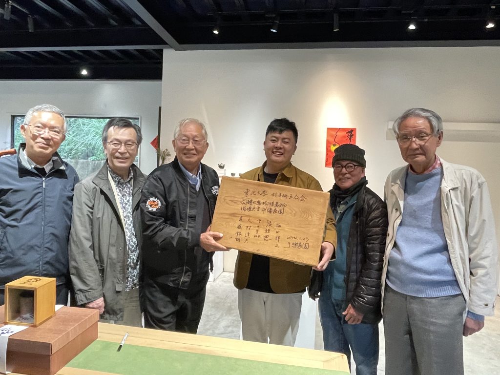 在張祖恩學生呂東璇的安排下,五兄弟連袂參訪苗栗樂晨窯,樂晨窯以柴燒為主,以創意把生活器物燒出獨特的品味,窯主彭宗文製作的茶具組合,特別把東北大學胡枝花校徽燒進去,還把五兄弟的名字一一燒到茶杯組,一組五個杯子,未來大家天各一方,喝茶時一定油然想起兄弟情。