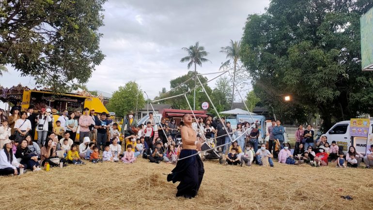 水交社園區內的馬戲樂園,成為親子流連忘返之地,看著街頭藝人各種精彩表演,掌聲不斷,小朋友也體驗走繩、踩球,劍玉,還可體驗釣環升空,旁邊的桂子山也吸引許多民眾前往認識水交社的前世今生。蕭壠文化園區舉辦「蕭壠14倉兒童藝術節」,前兩日已吸引超過兩萬餘人次前往,今年以「藝術HOW好玩」為主題,更有兒童劇團、市集、書展,兒童影展與藝術裝置,白日天氣炎熱,水舞秀更是大受歡迎。