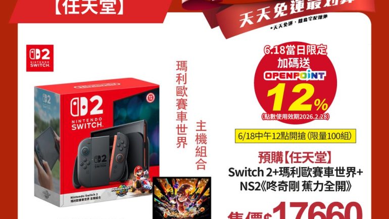 迎戰618購物節,「7-ELEVEN i預購」火力全開、88折讓任天堂鐵粉買到最新主機!6月18日中午12點起限量開搶「Nintendo Switch 2 瑪利歐賽車世界主機組合」加《咚奇剛 蕉力全開》中文版,售價17,660元,結帳即享12% OPENPOINT點數回饋,相當於88折優惠,一次入手NS2與兩款最新遊戲,任天堂粉絲絕對不能錯過!