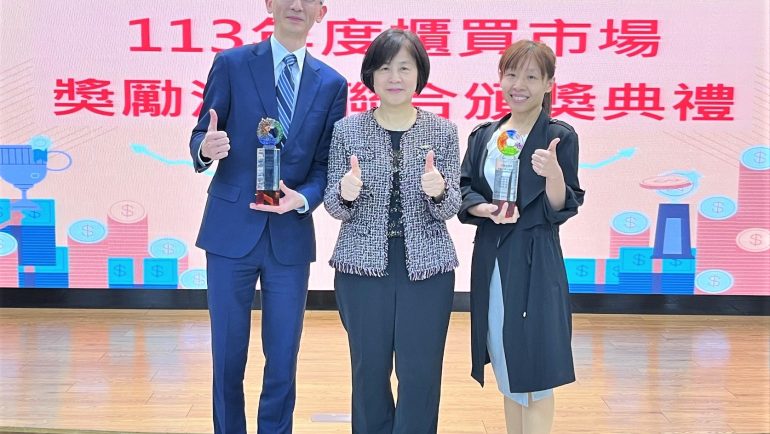 永豐金證券榮獲113年度櫃買市場獎勵活動9項獎項,由通路事業處高政雍副總經理(左)、策略交易部雷歸安副總經理(右)出席領獎,與櫃買中心陳麗卿總經理(中)合影。