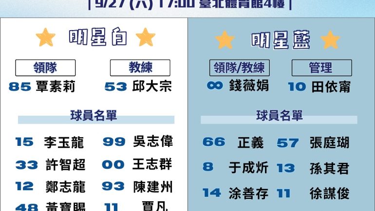 明星白由女籃資深國手覃素莉擔任領隊,邱大宗擔任總教練,球員名將如雲,除主辦單位中華文化教育暨體育交流促進會秘書長李玉龍外,還有許智超、鄭志龍、黃寶賜、楊志豪、劉嘉發、周泓諭、吳志偉、王志群、陳建州、賈凡、陳順詳、邱啟益、劉孟竹等。
