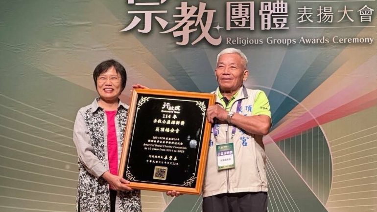 白河崁頂福安宮榮獲一一四年全國宗教公益深耕獎,該廟主委王春南接受內政部長劉世芳頒獎。 (記者翁聖權翻攝)