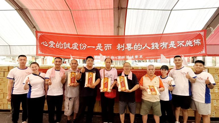 草寮後菱洲宮聯合福陽閣一票年輕的執事們,連十一年舉辦普度植福活動,今年白米來到一萬三千多公斤。(記者陳俊文攝)