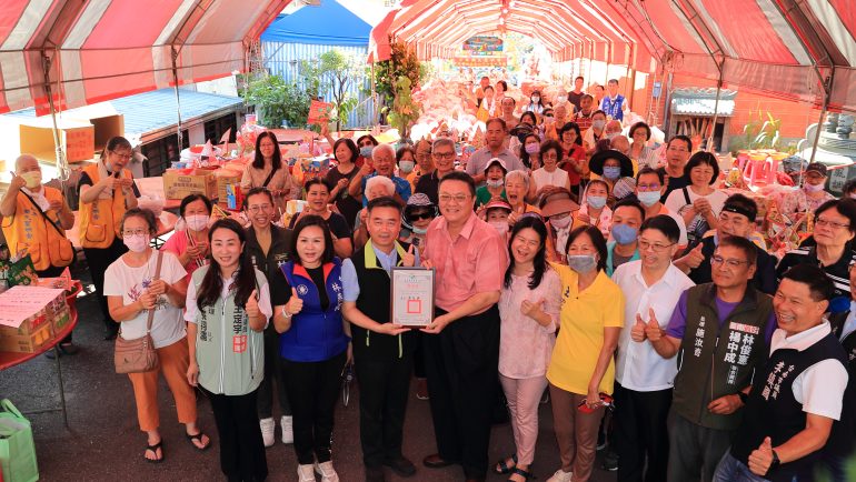 永康開天聖明宮舉辦慶讚中元,普渡植福,創辦人陳俊銘醫師(前排左四)捐贈132份物資發放永康區成功里132戶中低收入戶弱勢家族,由永康區長李皇興(前排左三)致贈感謝狀。 (記者趙傳安攝)