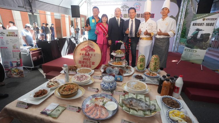 「二0二五台南國華松王宴」十九日將在台南市政府前南島路登場,立法院長韓國瑜(右四)表示「立法院認購二桌」。(中央社)