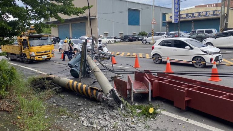 聯結車鋼材飛落撞斷電桿,造成五百多戶停電。(記者陸瓊娟攝)