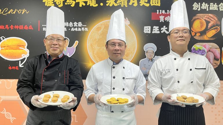 中秋將至,佳里奇美醫院營養科一日發表創新黃蔥辣韻的植萃馬卡龍,院長田宇峯、副院長王哲川巧扮大廚,現場手作好吃又低卡的馬卡龍,田宇峯說,有別於傳統月餅高油、高糖與高熱量,植萃馬卡龍降低熱量、減少身體負擔。