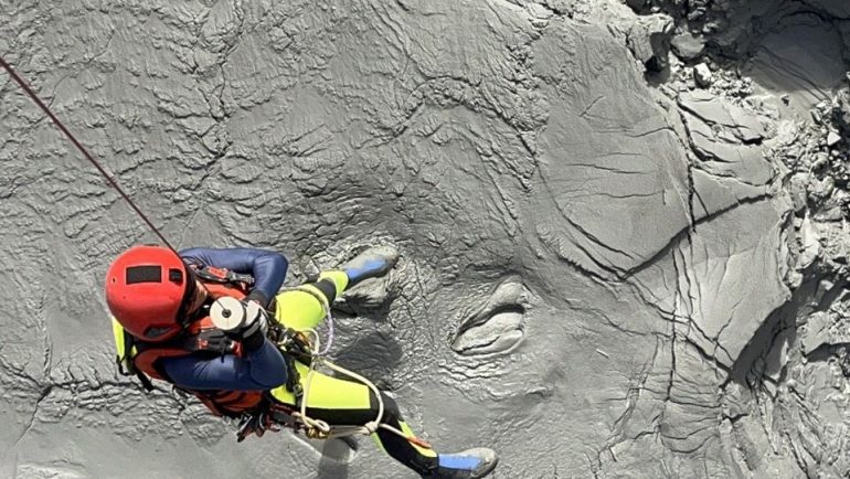 空勤總隊直升機二架次飛抵湖區委由特搜教官隨行,從機上垂降至壩頂探測地表狀況及協助安裝機具。(林業署花蓮分署提供) 記者林中行/花蓮報導 林業保育署表示,二日上午六由無人機航拍攝顯示,目前馬太鞍溪堰塞湖水位一千零二十公尺,湖區面積十二點六公頃,蓄水量五百八十萬噸,潰決後至今水位高程已下降一百一十九公尺,目前壩體持續下刷、蓄水量持續減少,約為原來量體之百分之六點四。 林業保育署指出,天然壩體及水流無異狀,湖水從溢流口穩定流出;考量溢流水道兩側持續下刷切割之坡面呈現不穩定、仍有水量持續匯入湖區以及下游土砂狀況尚未穩定,目前仍維持紅色警戒。 另外,今日林業保育署申請空勤總隊直升機二架次飛抵湖區安裝「小型水位觀測浮標」,探測湖區水下地形、深度等狀況,完成湖區探測後,方能評估如何安裝水位計,以更精確方式瞭解目前蓄水情形,同時將確認殘餘壩體之承載力、工程作業空間等,以評估相關減災工程之施工可行性。 林業保育署表示,現場觀測壩體土石鬆散缺乏穩固支撐,評估無法供直升機降落,特地協調二位特搜教官隨行,從機上垂降至壩頂探測地表狀況及協助安裝機具,經照片顯示,依舊一踩即陷,地表呈現軟爛狀,極為泥濘且鬆軟,足陷至少十餘公分,行走困難,直升機確實無法降落。
