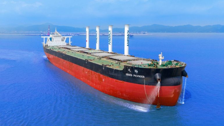 裕民航運與全球領先的風力推進技術供應商 Anemoi Marine Technologies Ltd.(Anemoi)共同宣布,裕民屬輪 「裕元輪」(Grand Pioneer)-32.5 萬載重噸超大型礦砂船(VLOC)於中遠舟山船廠順利完成 四具旋筒風帆安裝工程,成為台灣首家導入該技術的航運公司。(附圖由裕民航運提供)