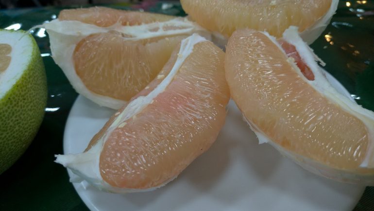 亞東醫院藥師林怡伶建議,中秋必吃的應景美果柚子服藥民眾「淺嘗一兩瓣」即可,避免影響藥效或增加副作用風險。(記者吳瀛洲攝)
