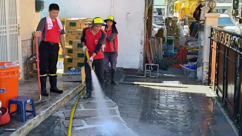 環保局大隊長邱雅琳表示,日前清理民宅獲得居民好評,吸引鄰近居民前來預約支援。團隊兩日已完成九戶民宅及一間農機行清理。面對牆面高達一層樓的淹水痕跡及厚重汙泥,環保局調派清溝車與灑水車強力沖洗,再由同仁化身「刷子超人」、「刮水超人」合力清潔,總計完成約五千二百平方公尺清理,協助居民家園逐漸恢復整潔。