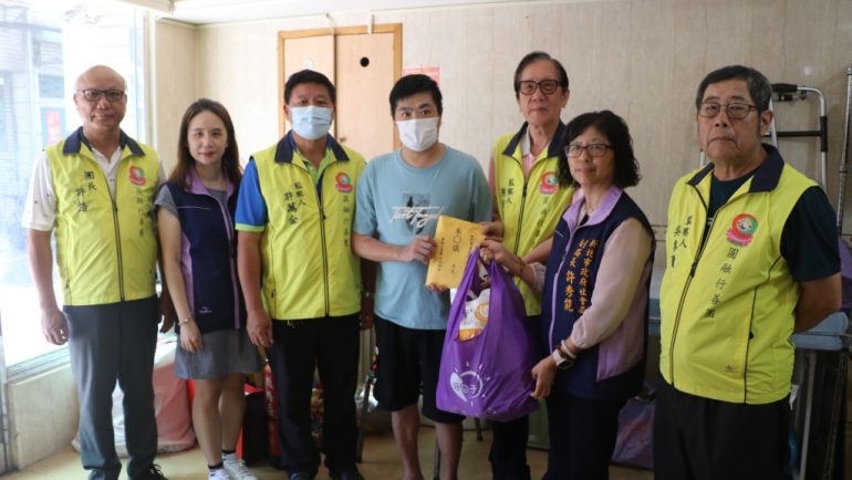 圓融行善團團長許誥(左1)和新北市社會局副局長許秀能(右2)等 一起將善款和民生物資送給朱爸(中)。(新北市社會局提供)