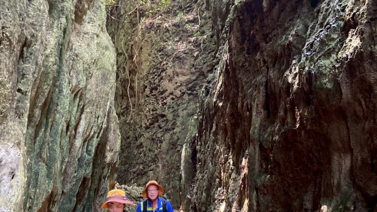 先是大峽谷,這要學猴子手腳並用的攀爬,再來更是路寬僅一人可側身走的小錐麓,確實要膽大心細,慢慢走,通過了考驗後,來到百餘年的七里香老樹群,更有盤根錯節的老榕,可以好好的吃個午餐,以便再進入泰國谷和那美麗的一簾幽夢,來到如此美景,大家肯定要爭相拍照留影的,接著京到了猴岩,也許猴兒都休息去了,在山徑上未見到成群的獼猴,頂多就是落單的一兩隻坐在步道上納涼。
