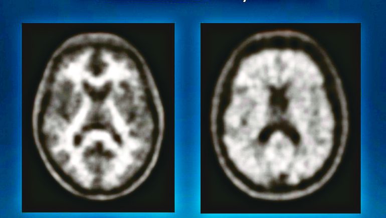 類澱粉蛋白正子造影檢查,圖左為正常的大腦影像,圖右顯示腦內充斥類澱粉蛋白。(聯新國際醫院提供)