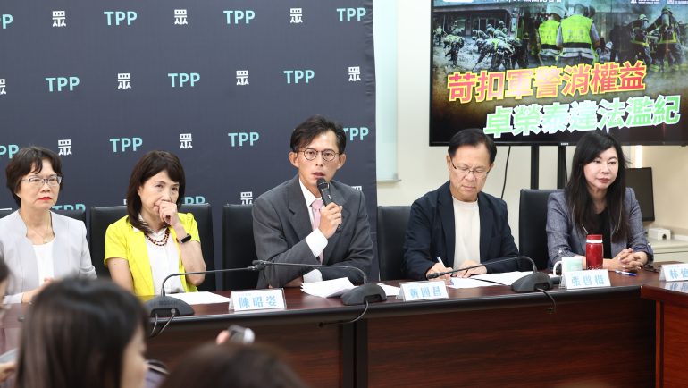 民眾黨立法院黨團針對行政院未依法編列提高軍人待遇、警消退休金預算,宣布將對總預算案提出復議案。(中央社)